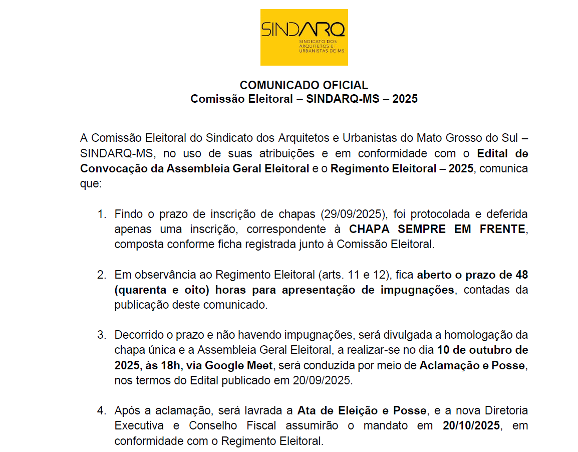 Sindarq/mS divulga encerramento do prazo para impugnações e seguimento do processo eleitoral